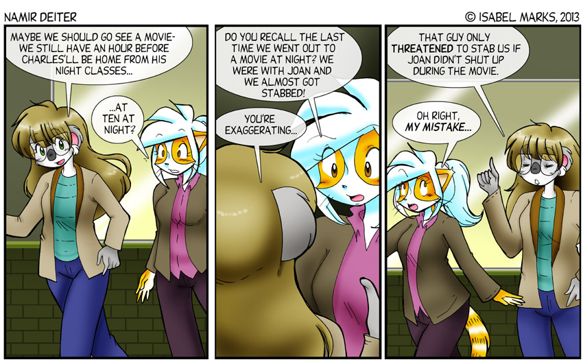 Namir Deiter is © Isabel Marks, 1999-2012. Do not distribute any images on this site without the artist's permission and without giving credit to the Isabel Marks (including a link back to https://namirdeiter.com). Namir Deiter has been on the web since November 1999 and usually updates Monday, Wednesday, and Friday at around midnight PST.