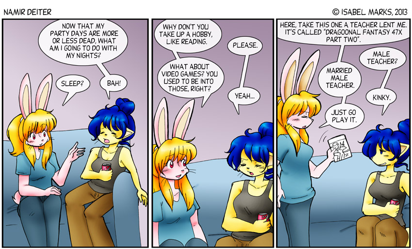 Namir Deiter is © Isabel Marks, 1999-2012. Do not distribute any images on this site without the artist's permission and without giving credit to the Isabel Marks (including a link back to https://namirdeiter.com). Namir Deiter has been on the web since November 1999 and usually updates Monday, Wednesday, and Friday at around midnight PST.