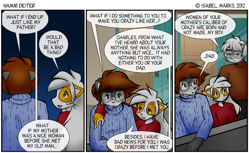 | Namir Deiter is © Isabel Marks, 1999-2012. Do not distribute any images on this site without the artist's permission and without giving credit to the Isabel Marks (including a link back to https://namirdeiter.com). Namir Deiter has been on the web since November 1999 and usually updates Monday, Wednesday, and Friday at around midnight PST.