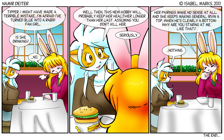 Namir Deiter is © Isabel Marks, 1999-2012. Do not distribute any images on this site without the artist's permission and without giving credit to the Isabel Marks (including a link back to https://namirdeiter.com). Namir Deiter has been on the web since November 1999 and usually updates Monday, Wednesday, and Friday at around midnight PST.