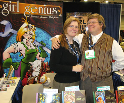 Our first stop was the Girl Genius booth. We stopped by and talked with Phil and Kaja Foglio. Girl Genius is one of my favorite comics. I've been a fan of the Foglios since I was in middle school. I had a total fanboy moment and couldn't think of anything to say, besides "It's so great to meet you, I love your work" and "I'll take four books and all of the pins", of course. I got a sketch from both of them, as well. Isabel took a picture of them. Kaja took a picture of us. I'm very, very pleased that they enjoy our comics too.